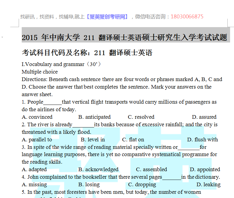 2015 年中南大学 211 翻译硕士英语硕士研究生入学考试试题
