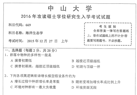 2016年中山大学669海洋生态学硕士研究生入学考研真题