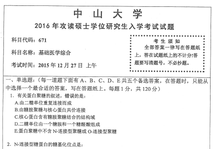 2016年中山大学671基础医学综合硕士研究生入学考研真题