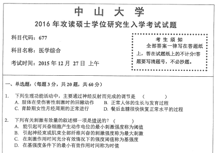 2016年中山大学677医学综合硕士研究生入学考研真题