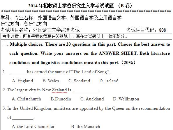 Ⅰ. Multiple choices. There are 20 questions in this part. Choose the best answer to each question. Write your answers on the ANSWER SHEET. Both literature candidates and linguistics candidates must do this part.(20%)