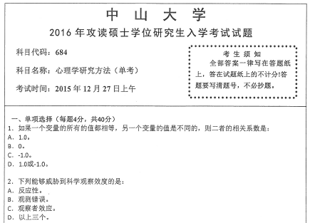 2016年中山大学684心理学研究方法(单考)硕士研究生入学考研真题