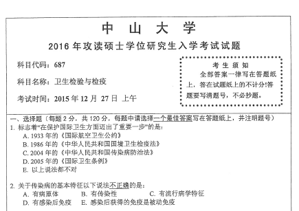 2016年中山大学687卫生检验与检疫硕士研究生入学考研真题