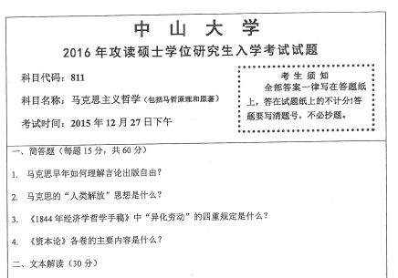 2016年中山大学811马克思主义哲学硕士研究生入学考研真题