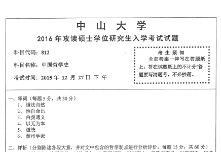 2016年中山大学812中国哲学史硕士研究生入学考研真题