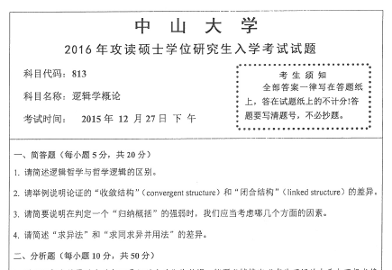 2016年中山大学813逻辑学概论硕士研究生入学考研真题