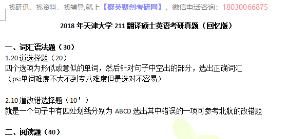 聚英天津大学考研网小编整理了2018年天津大学211翻译硕士英语考研真题(回忆版),部分内容如下: