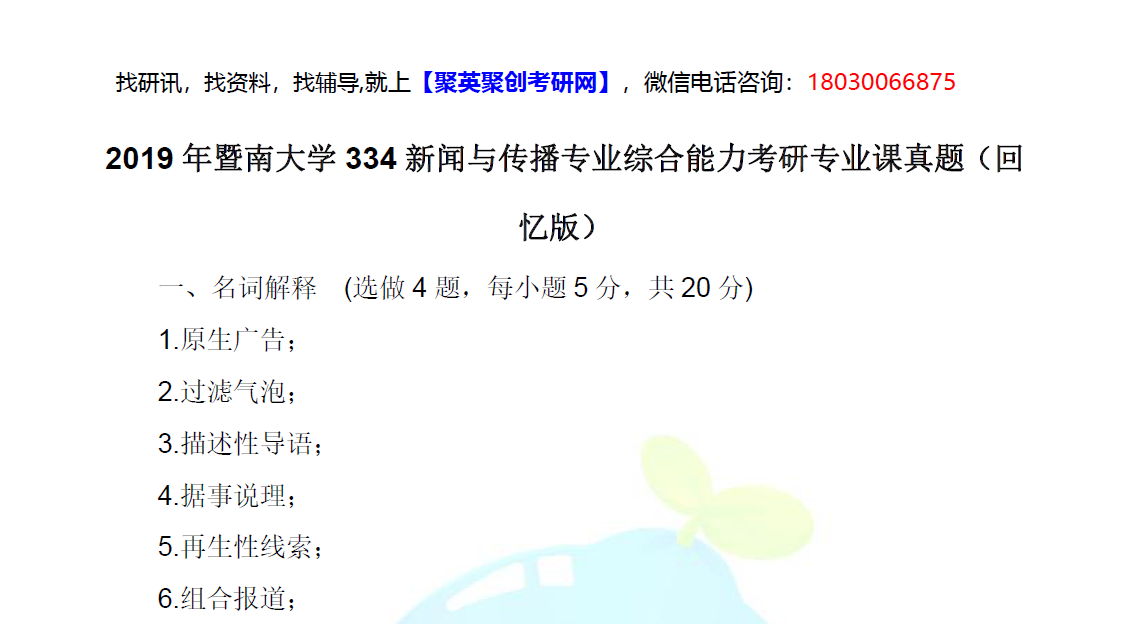 聚英暨南大学考研网整理了2019年暨南大学334新闻与传播专业综合能力考研专业课真题(回忆版),部分内容如下: